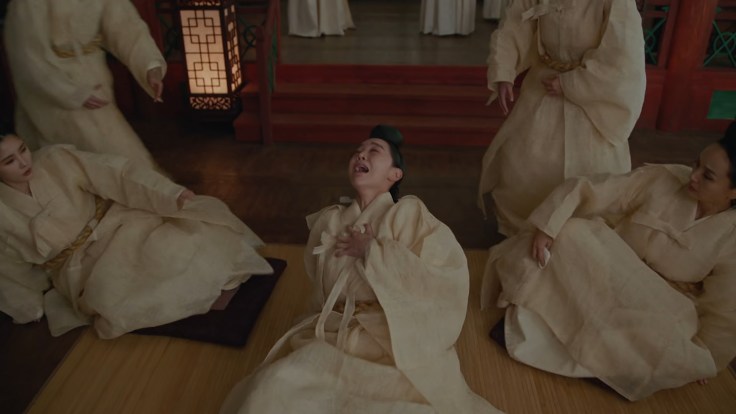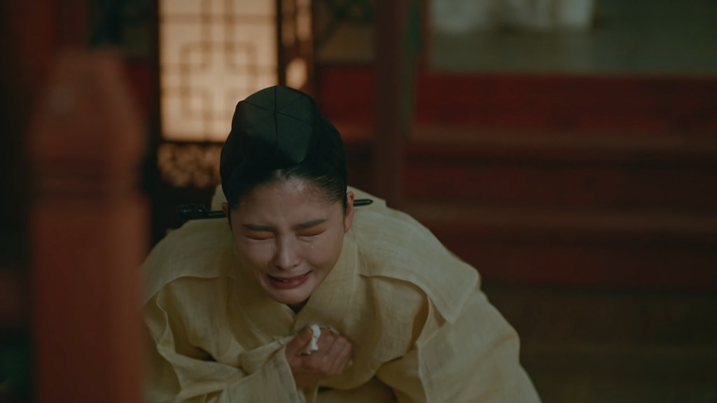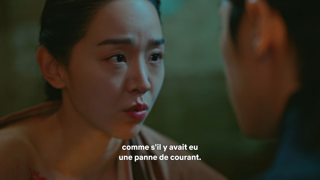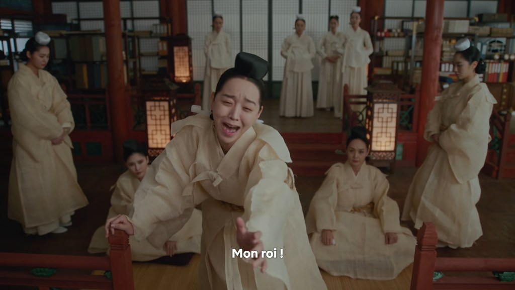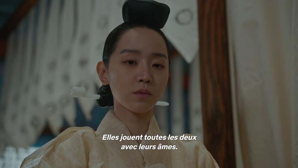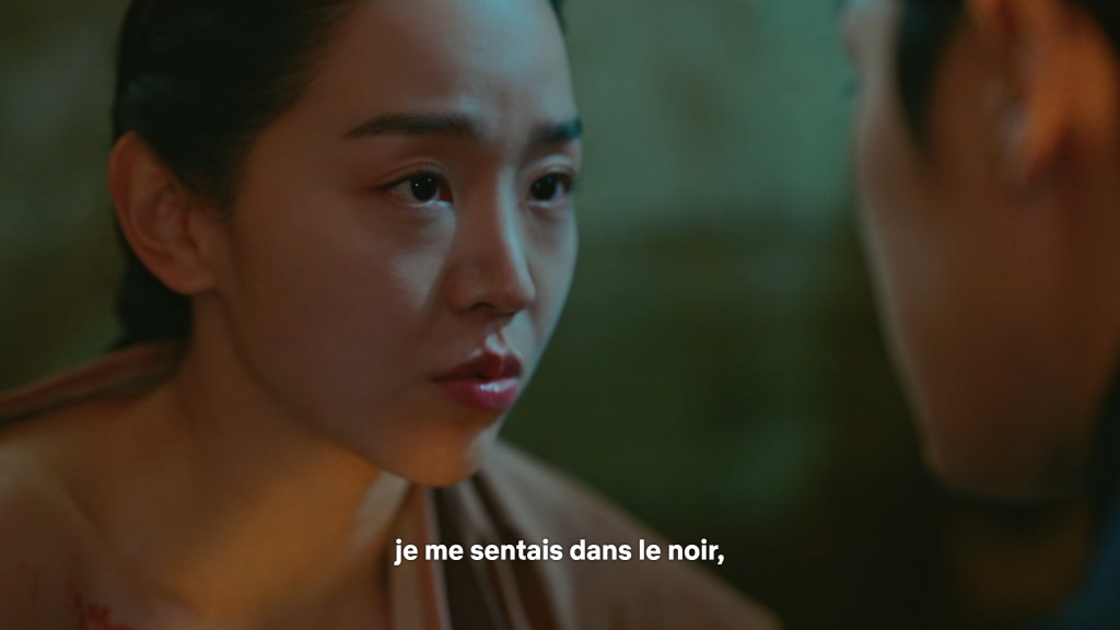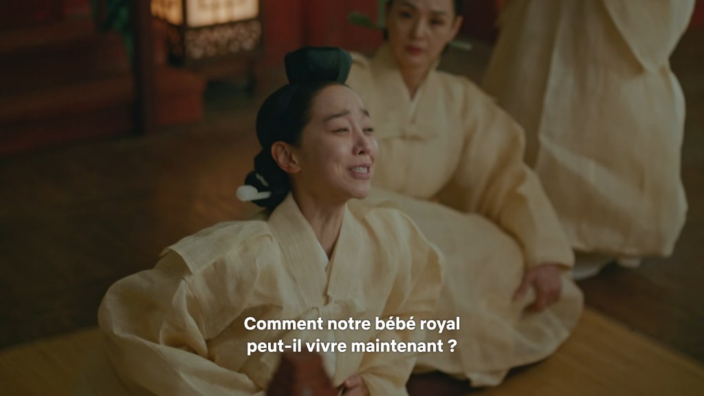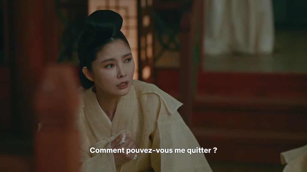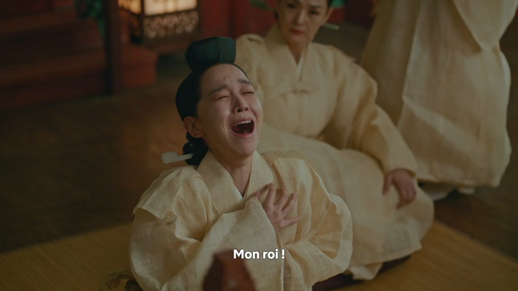 Les dialogues et la mise en scène sont également de très bonne facture. Ici, la scène où Kim So Yong vient d’apprendre que le roi n’est pas mort. Les deux reines dont l’une est la commanditaire de la tentative de meurtre viennent pleurer à ses côtés pour donner le change. La séquence commence par une voix intérieure. Toutes les trois mentent mais une seule a conscience de ce qui se trame.