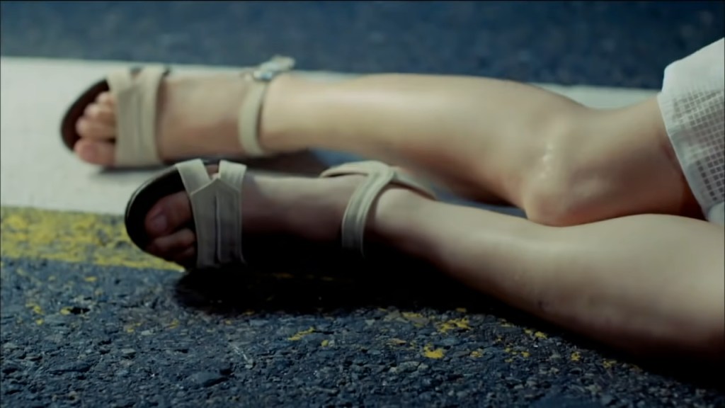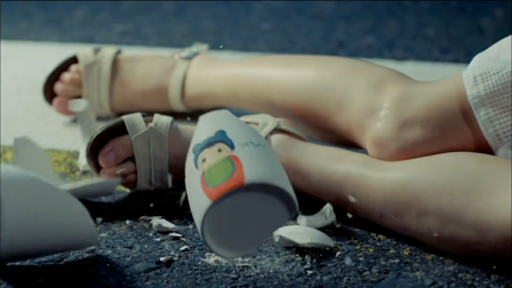 Un gros plan des jambes de Mi-young étendue sur la route, quelques gémissements, les passants alentours qui commencent à réagir et la tasse de l’enfant qui se brise à son tour sur le sol.