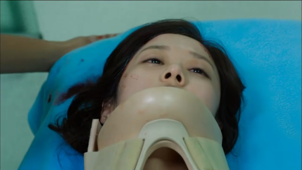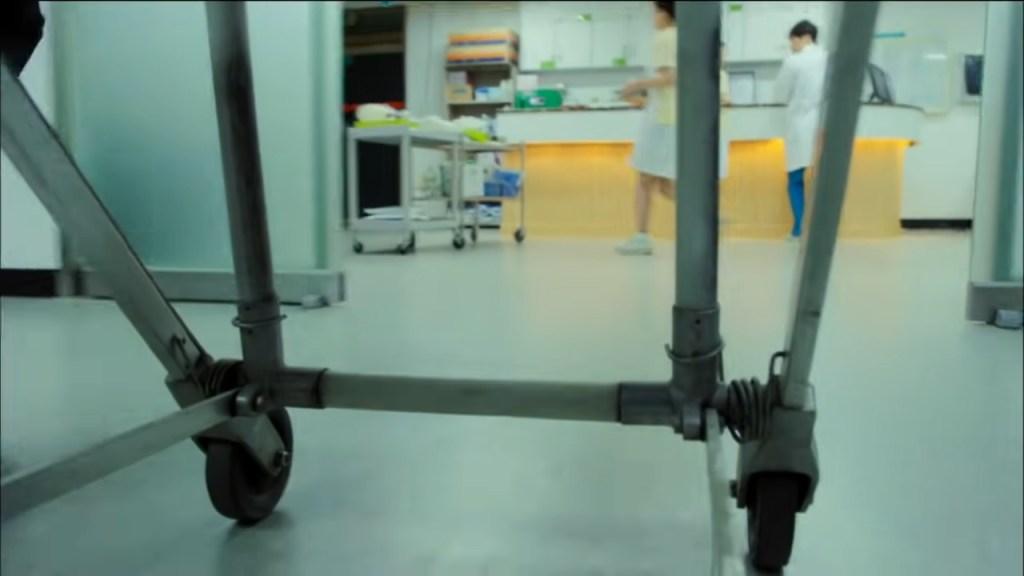 Cette scène est magistrale parce qu’elle joue sur l’ellipse sonore et le rythme du montage, sans exagération ni effets spéciaux inutiles. Elle symbolise le point de bascule où Gun prend conscience de l’ampleur de son erreur : en voulant protéger Mi-young en la repoussant, il vient de provoquer le pire. Pas de raccord point de vie sur Mi-young. Le plan suivant filme les roulettes en mouvement d’un brancard dans un couloir d’hôpital, suivi d’un gros plan du visage de Mi-young avec une minerve autour du cou.