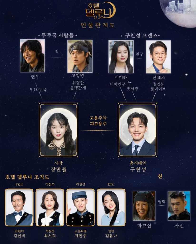 IU (Lee Ji-eun) incarne Jang Man-wol, la propriétaire capricieuse et fantasque de l’Hôtel del Luna. Condamnée à diriger cet établissement depuis plus de treize siècles pour expier les crimes commis dans sa vie passée, elle alterne entre distance glaciale, colère et mélancolie. Connue pour son goût prononcé du luxe et de l’extravagance, elle se drape dans des tenues somptueuses, conduit des voitures de sport et ne se prive jamais d’un champagne hors de prix. Derrière cette façade arrogante se cache pourtant une âme tourmentée, figée dans le temps et incapable de se libérer du poids de ses fautes et de ses amours perdus.