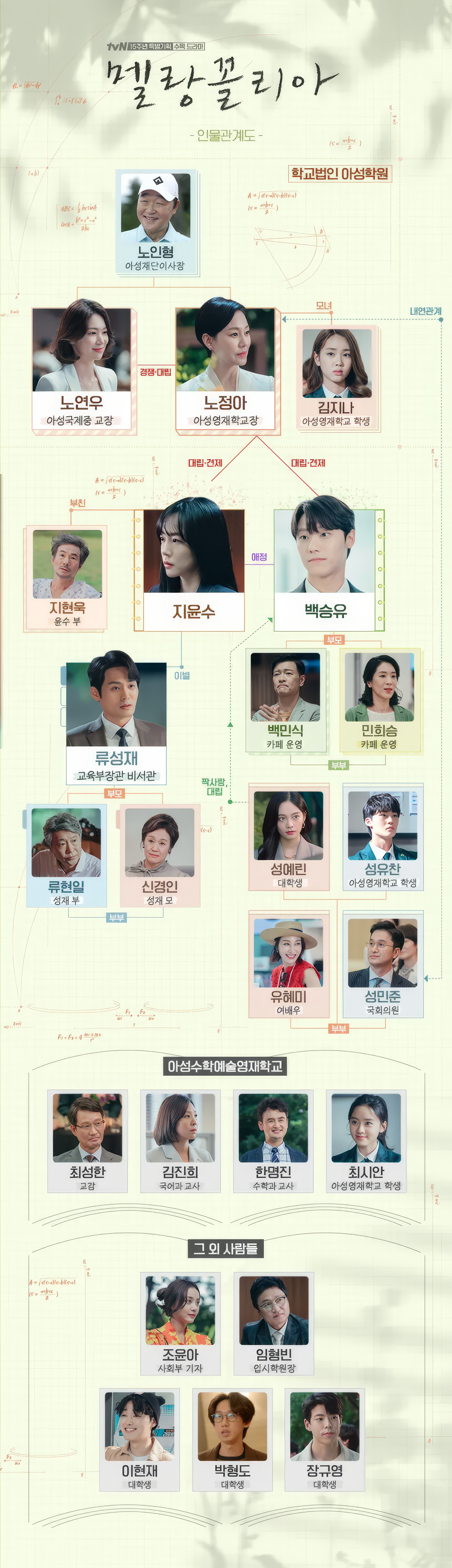 No Jung-ah, antagoniste majeure, incarne la corruption intellectuelle à son plus haut degré. Brillante autrefois, elle a renoncé à la recherche et à la vérité scientifique pour s’assurer une position de pouvoir au sein d’Asung. Elle manipule élèves, résultats et réputations avec une froide lucidité, convaincue que la fin justifie les moyens. Face à Ji Yoon-soo, elle voit une menace existentielle : une enseignante qui aime réellement transmettre et qui croit encore à la vérité mathématique. Son arc est celui d’une chute sans rédemption. Incapable de reconnaître ses fautes, No Jung-ah préfère s’accrocher à son autorité jusqu’à l’effondrement, illustrant la faillite morale de ceux qui transforment le savoir en instrument de domination.